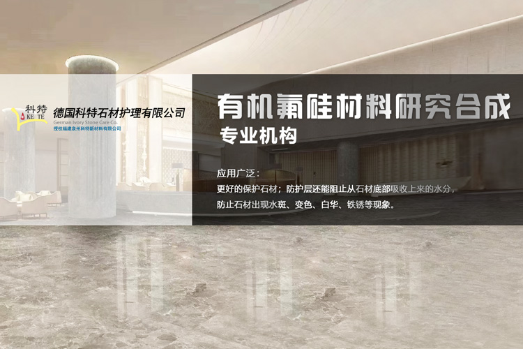 福建泉州科特新材料有限公司(Germany Kurt Ke Te)是德國從事有機(jī)氟硅材料研究合成的專業(yè)機(jī)構(gòu)。對(duì)于一些吸水性基材(石材、磚瓦、混凝土),它讓氟硅元素的有效成分滲透到基材的空隙(毛細(xì)管)中,在基材內(nèi)部形成一個(gè)防護(hù)層,表面達(dá)到防油效果,同時(shí)保持石材的透氣性,從而更好的保護(hù)石材。此外,防護(hù)層還能阻止從石材底部吸收上來的水分,防止石材出現(xiàn)水斑、變色、白華、鐵銹等現(xiàn)象。